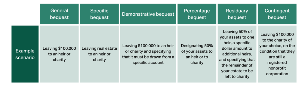 There are multiple types of bequests to consider when estate planning, and charitable bequests can fall into any of these categories: