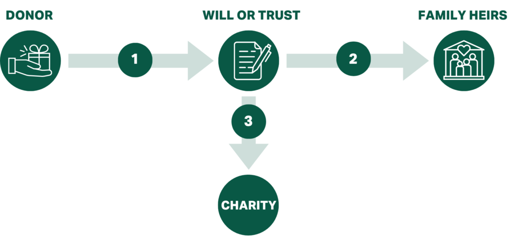 Bequests or bequeathments to charity are gifts made as part of a will or trust during the estate planning process. Just as you’re able to leave cash and non-cash assets to heirs and loved ones, you can choose to bequest any amount to the nonprofit organization of your choice to ensure that your legacy includes a commitment to charitable impact and advancement of social good.