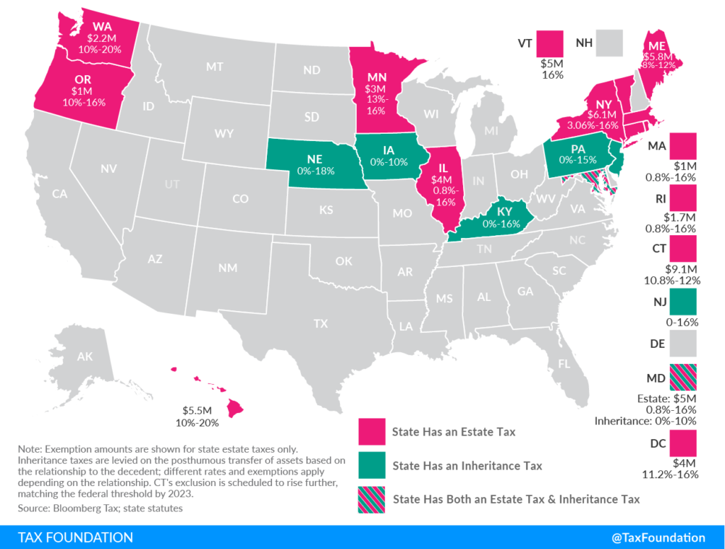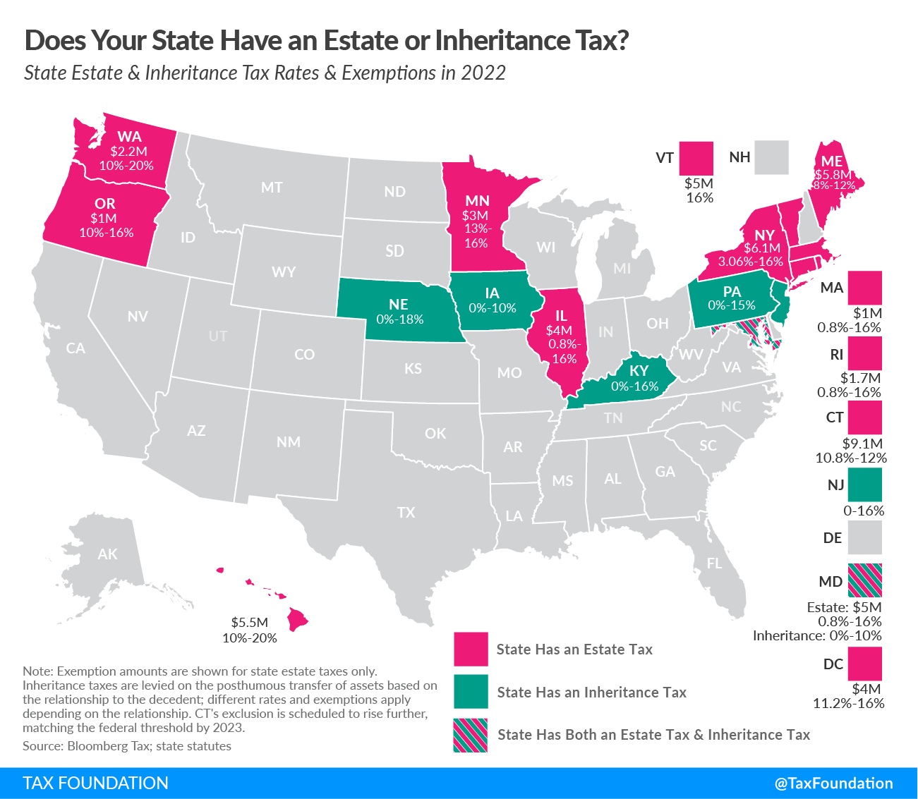 There are currently 17 states that impose an additional estate and/or inheritance tax. See this map to check state estate and inheritance tax rates and exemptions in 2022: