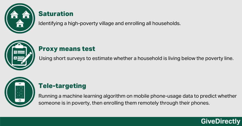 Our pilot in Khongoni is not just designed to distribute money, but also to answer an important question: what are the best methods for identifying people in poverty across wide and diverse regions? There is no working list of everyone living in extreme poverty, and identifying them is not a simple task. For this pilot, we’re testing three methods of targeting, or identifying who is eligible or not: