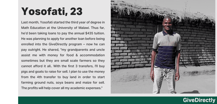 Last fall, GiveDirectly and Canva, the visual communication platform, announced a partnership to give money directly to some of the world’s poorest people – a $10 million pilot that is sending a basic income through mobile money payments to people in extreme poverty in Khongoni, Malawi. The pilot, launched this March, will deliver ~$50 per month for 12 months to 12,800 adults, ensuring they’re above the extreme poverty line for a year. And they’re free to spend the money however they like – to decide for themselves how best to improve their own lives.