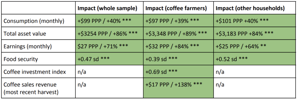 - Both coffee farmers (defined as farmers reporting selling coffee recently at baseline) and non-coffee farmers reported significant improvements in the 4 primary measures of economic well-being we studied: they consumed $99 more per month (PPP), earned $27 more (PPP) , and had considerably more assets (+$3524, PPP) and greater food security (+0.47 standard deviations).