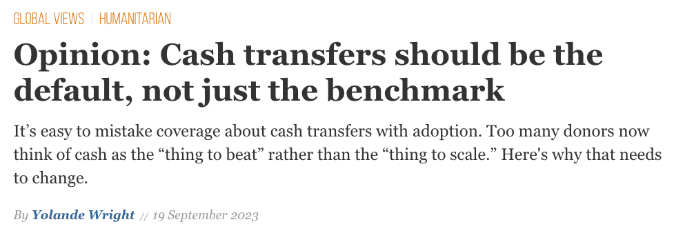 But it’s easy to mistake coverage about cash transfers with adoption. It’s likely less than 5% of official development assistance goes to cash programming — though no one is tracking the exact amount. With all this evidence of adaptability and impact, why is so little development assistance given directly to people living in poverty? The answer may be that too many donors now think of cash as the “thing to beat” rather than the “thing to scale.”