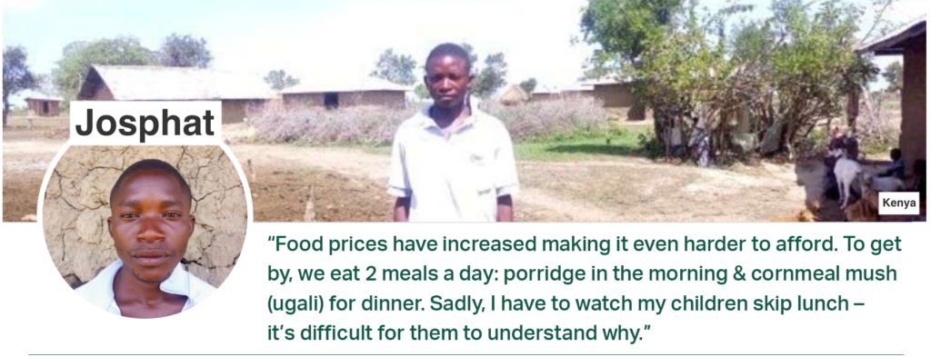 You’ve likely been impacted by the cost of living crisis: U.S. gas prices spiked this summer and energy prices are still at all-time highs across Europe. While overall inflation in high-income countries is at 6%, in low-income countries it’s at 9%. Consumers in wealthy countries can often switch from higher-quality goods to lower-quality ones, an option not possible for recipients like Josphat.