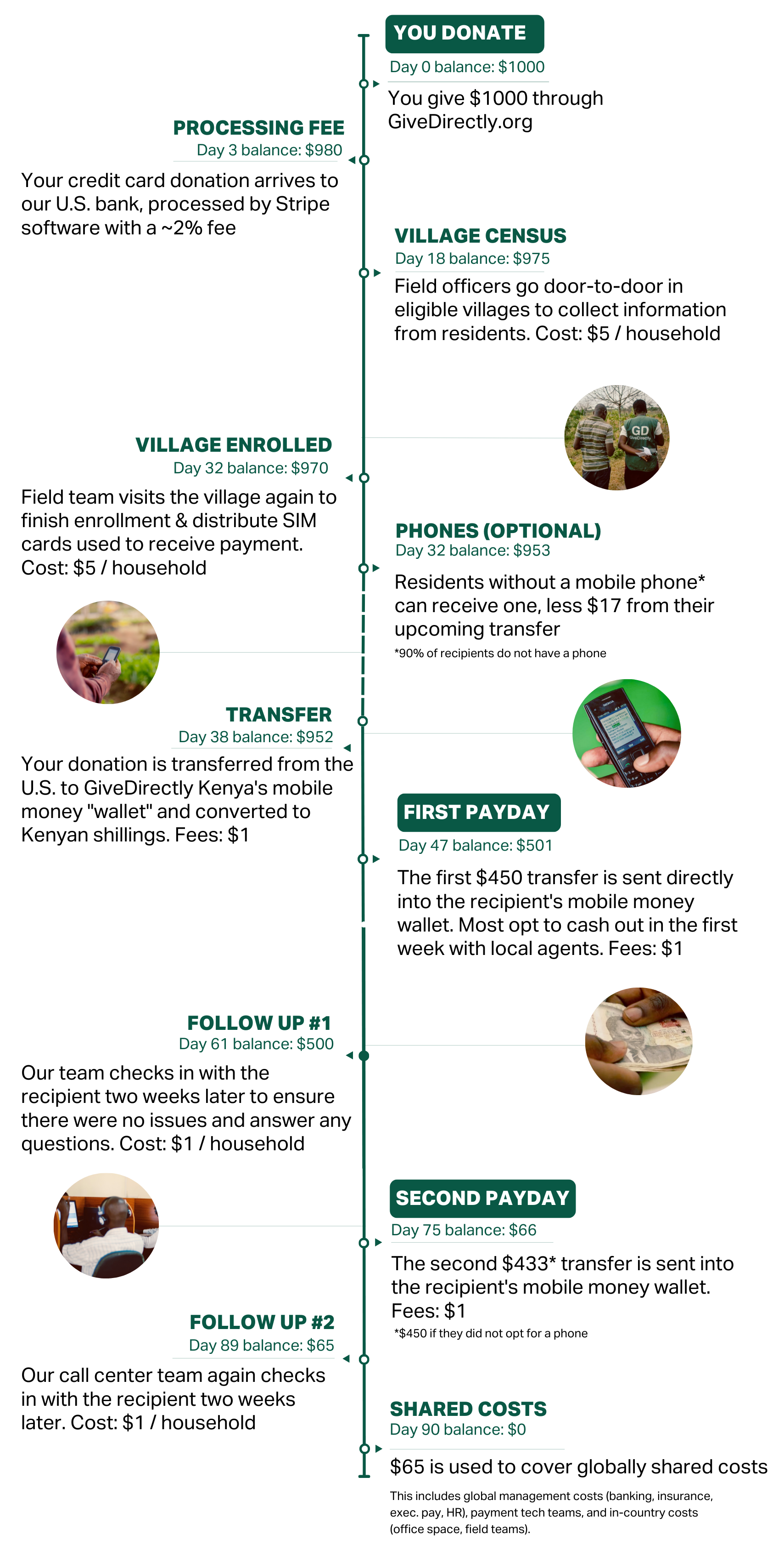 When explaining what GiveDirectly does, we sometimes get asked whether 100% of funds go to recipients. That’s no different than asking whether GiveDirectly has any costs.