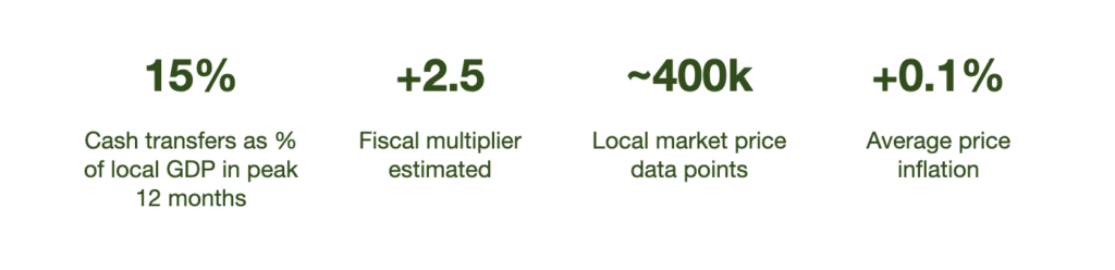 For example, to understand the effects on inflation, researchers conducted monthly surveys for 2.5 years across 61 markets and 72 products. And researchers surveyed enterprises and households (both recipients and non-recipients) to estimate the “multiplier” effect, finding that $1 of cash delivered generated $2.60 in additional spending or income for the local economy.