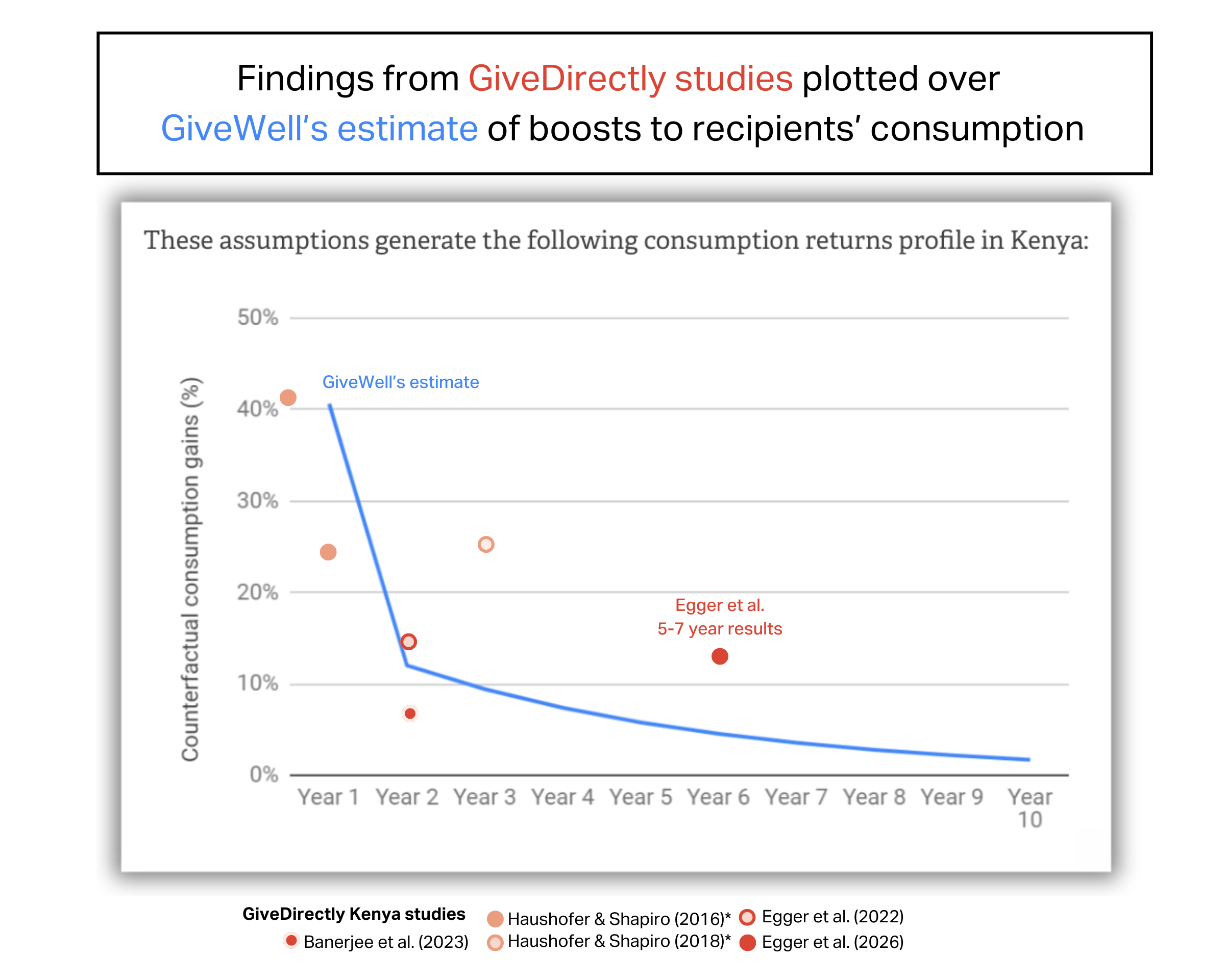 - GiveDirectly’s longest run published studies measure impacts <3 years later, including in the Egger et al. study which found ~2 years after receiving cash, families were spending 13% more than the control group. Unpublished data from the same study has found 5-7 years later these families are still spending 12% more.