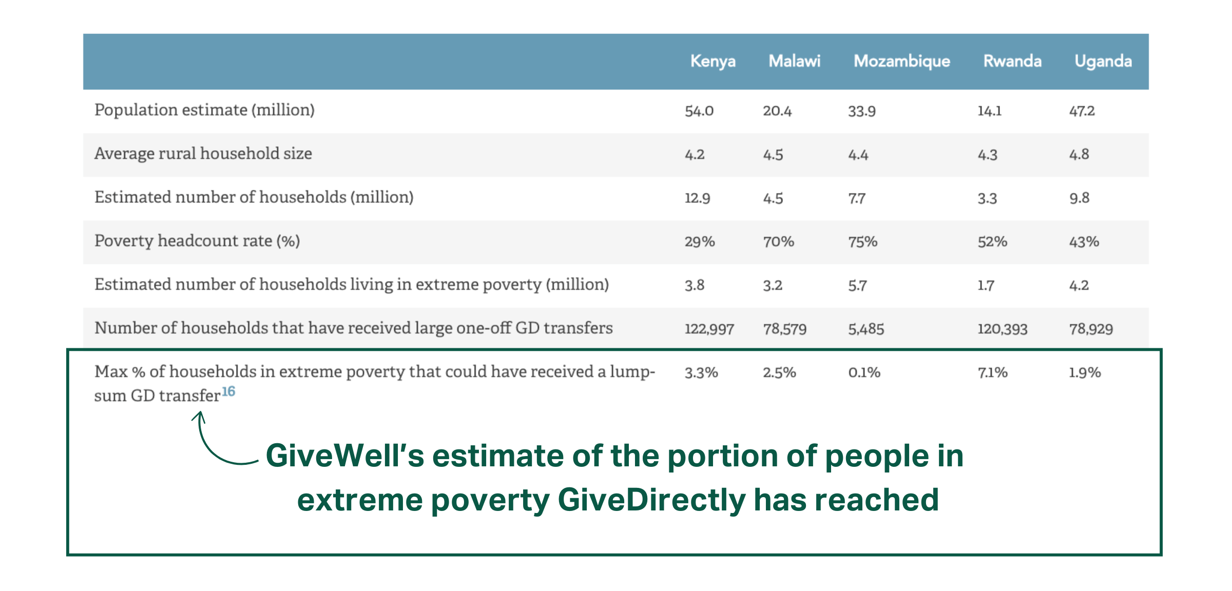 - GiveWell says their “previous model assumed that baseline consumption in Malawi, Mozambique, Rwanda and Uganda was similar to consumption levels we had calculated in Kenya. Now, we believe that consumption in those newer locations is lower than Kenya.”
