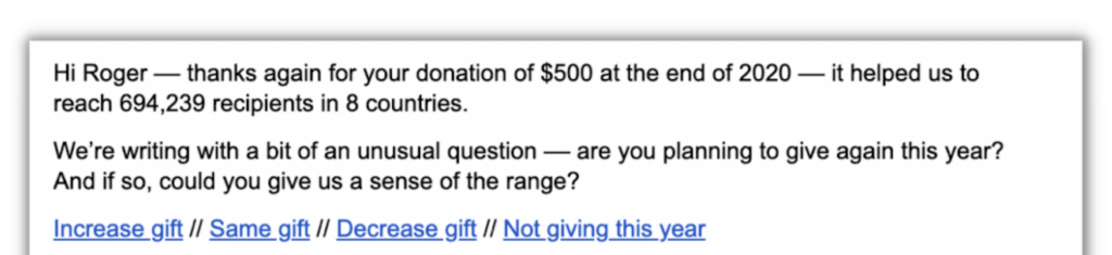 Every year, anywhere from 14% to 75% of the donations we receive from individuals come in December (before the U.S. tax deadline). This volatility makes it difficult to forecast how much money we can deliver to people in poverty the following year. So in summer 2021, we tested sending emails to donors to ask how much they planned to give at the end of that year: