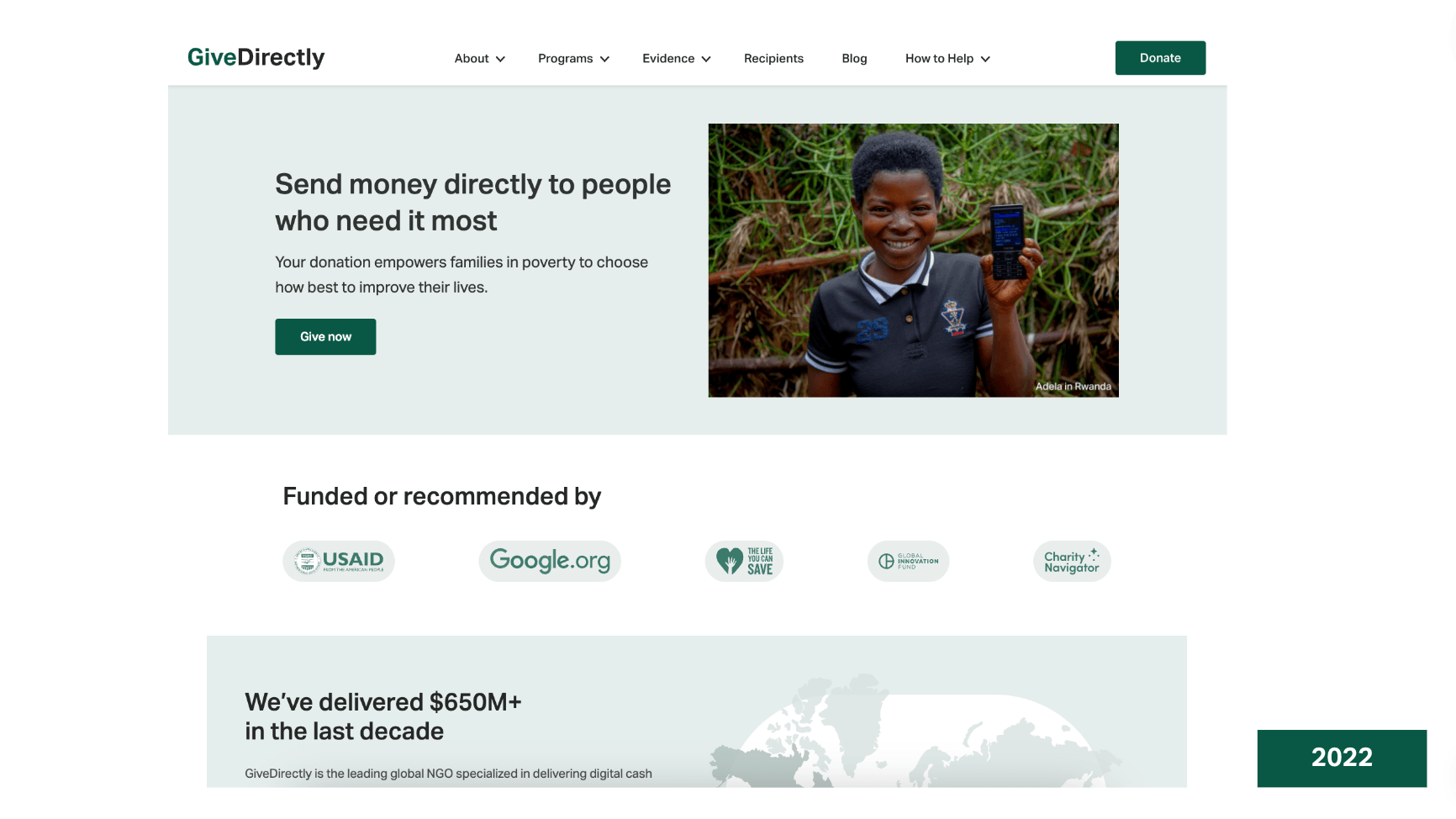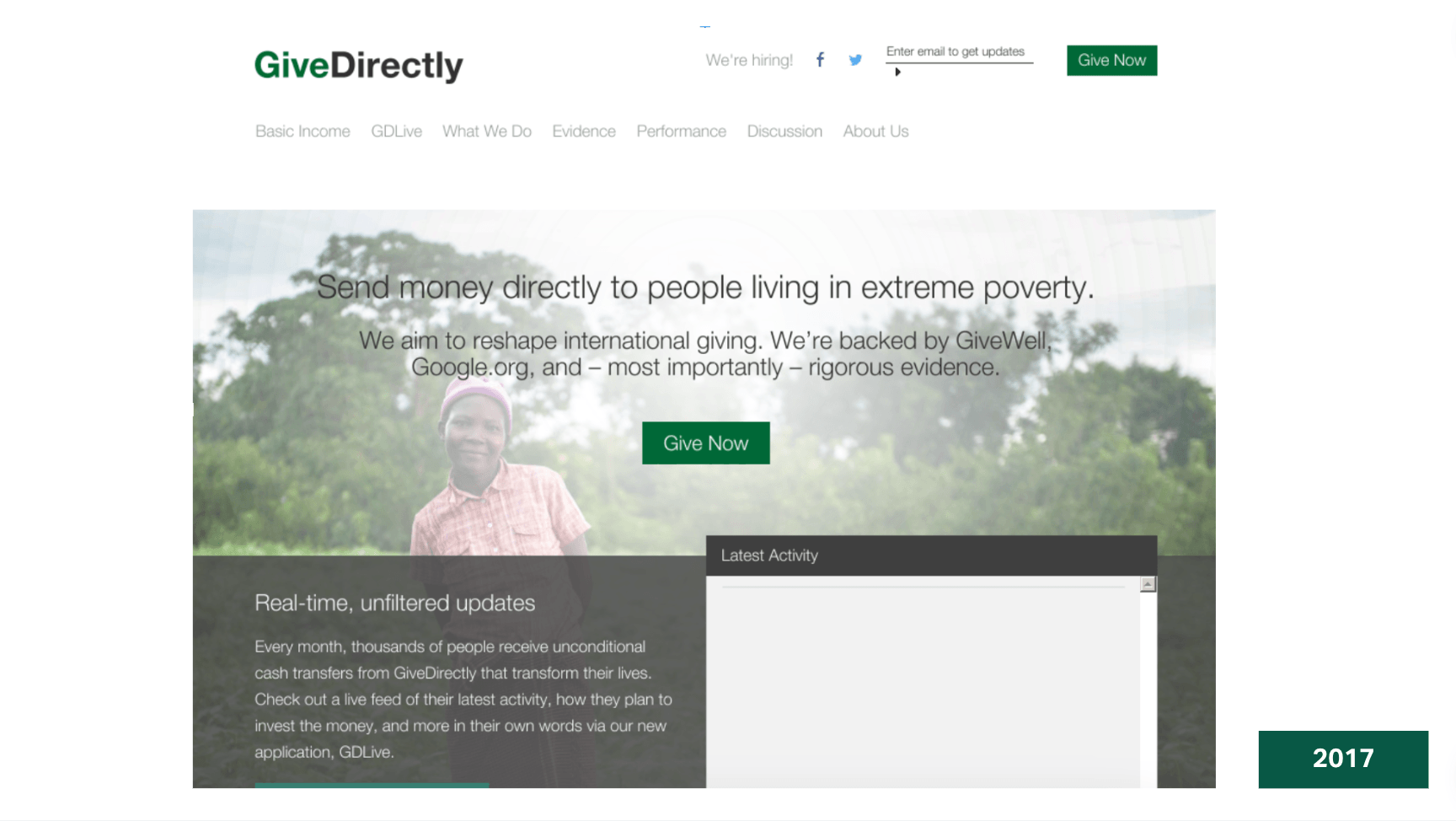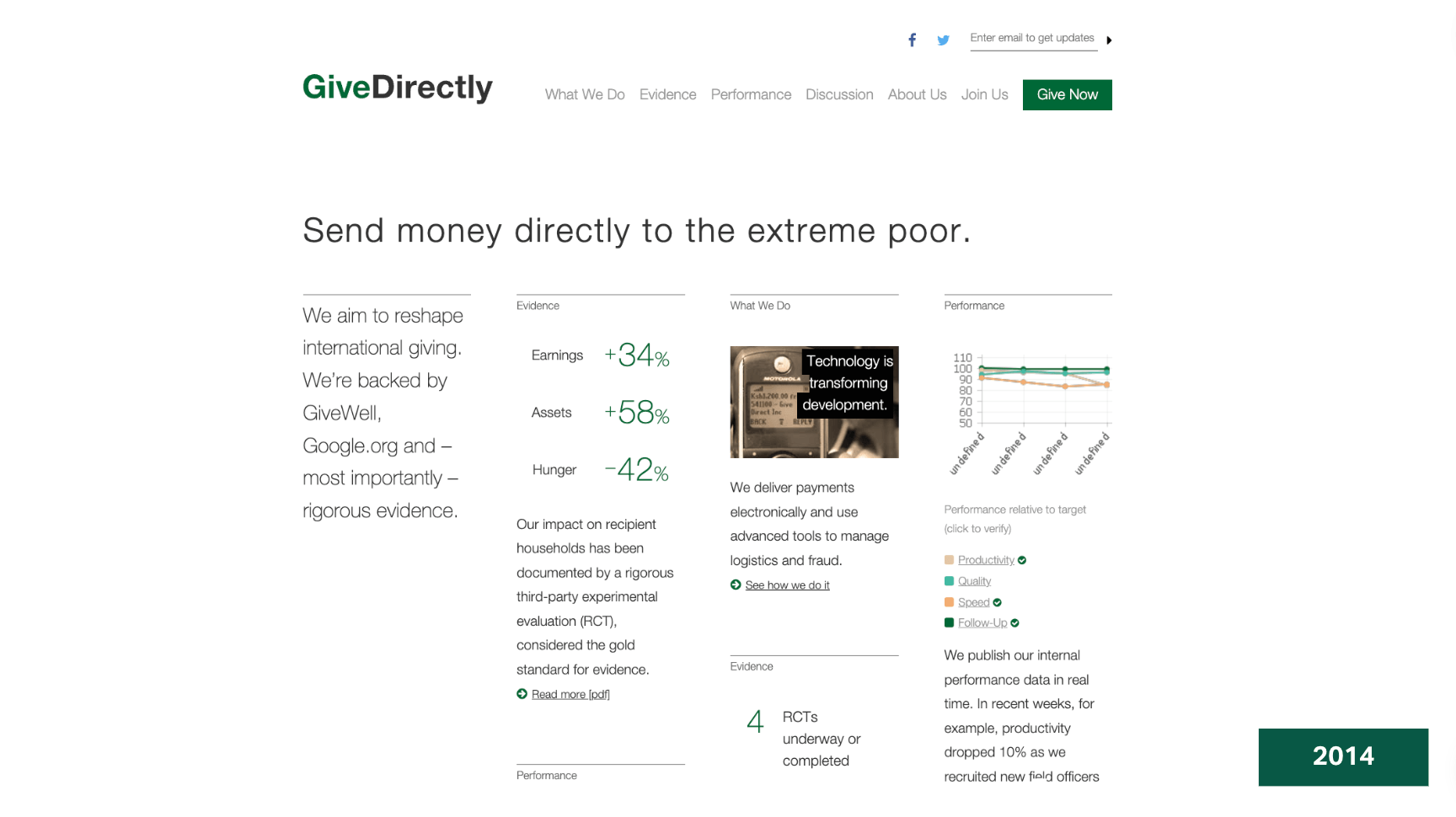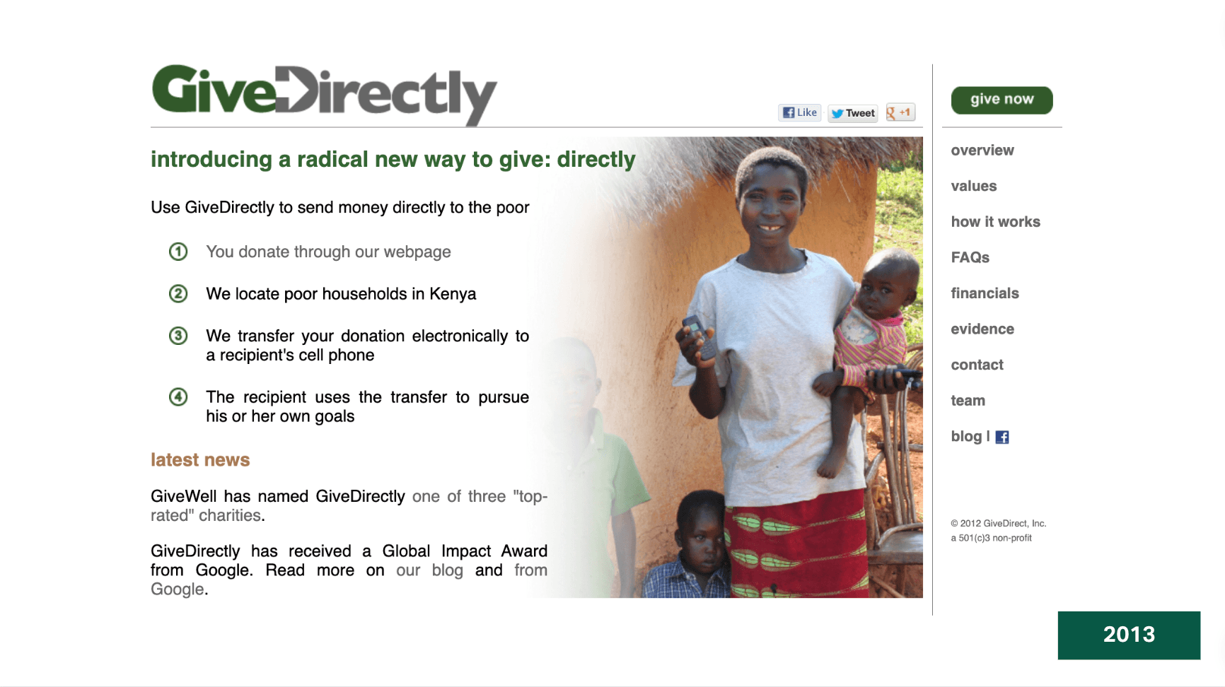 GiveDirectly only started a fundraising team a few years after it was founded, and that very small team only had the resources to maintain a pretty bare-bones website. Because many early donors were drawn to us due to the evidence behind cash transfers, we thought this website conveyed that we were more focused on efficiently delivering your dollars than slick marketing.