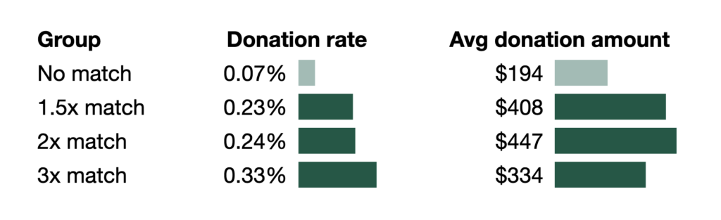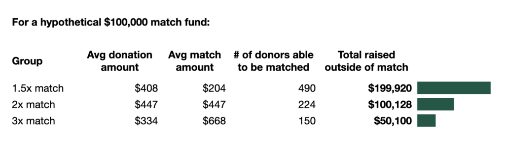 Donors who seed matches typically don’t have stipulations for how to structure the match. So we created an email experiment testing various match sizes (1.5x, 2x, and 3x) compared to a control group asked to give without a match, and we found that: