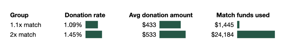 The 1.1x match convinced 25% fewer donors to give compared to the 2x match, and the average donation was 19% lower