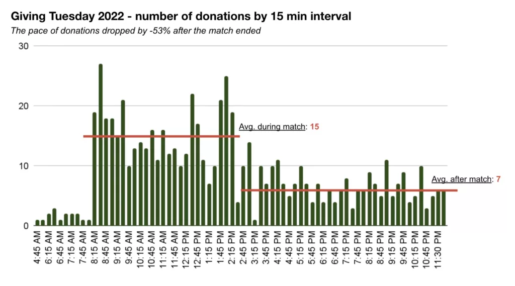 The short answer is yes: Existing evidence shows that matches do raise more money, and we’ve seen similar results with our own tests — offering a match raised 7-8x more money than asking for donations without a match. On Giving Tuesday in 2022, the pace of donations dropped by half after the $150,000 match fund was used up around 2:30pm: