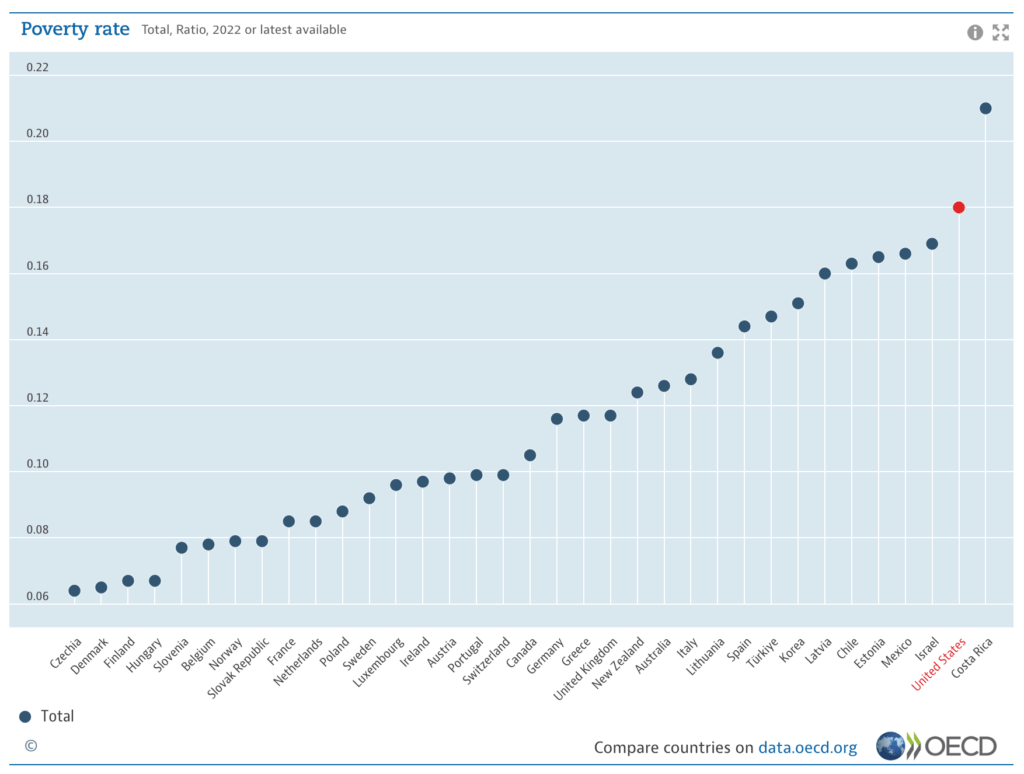 The U.S. spends about what most wealthy countries spend on social protection, but much of that spending goes to poorly designed social programs that carry excessive bureaucratic burden, meaning qualified families do not enroll – over a quarter of Americans living in deep poverty (less than half of the federal poverty line) are not enrolled in any federal safety net program. Furthermore, many of these programs are not unconditional cash aid, and instead take the form of less effective and paternalistic in-kind or conditional support (e.g. CA’s WIC requirements). Furthermore, they definitionally exclude millions of undocumented households. These failures are why, despite significant spending, the U.S. still has the second highest poverty rate relative to national income of any wealthy country in the world: